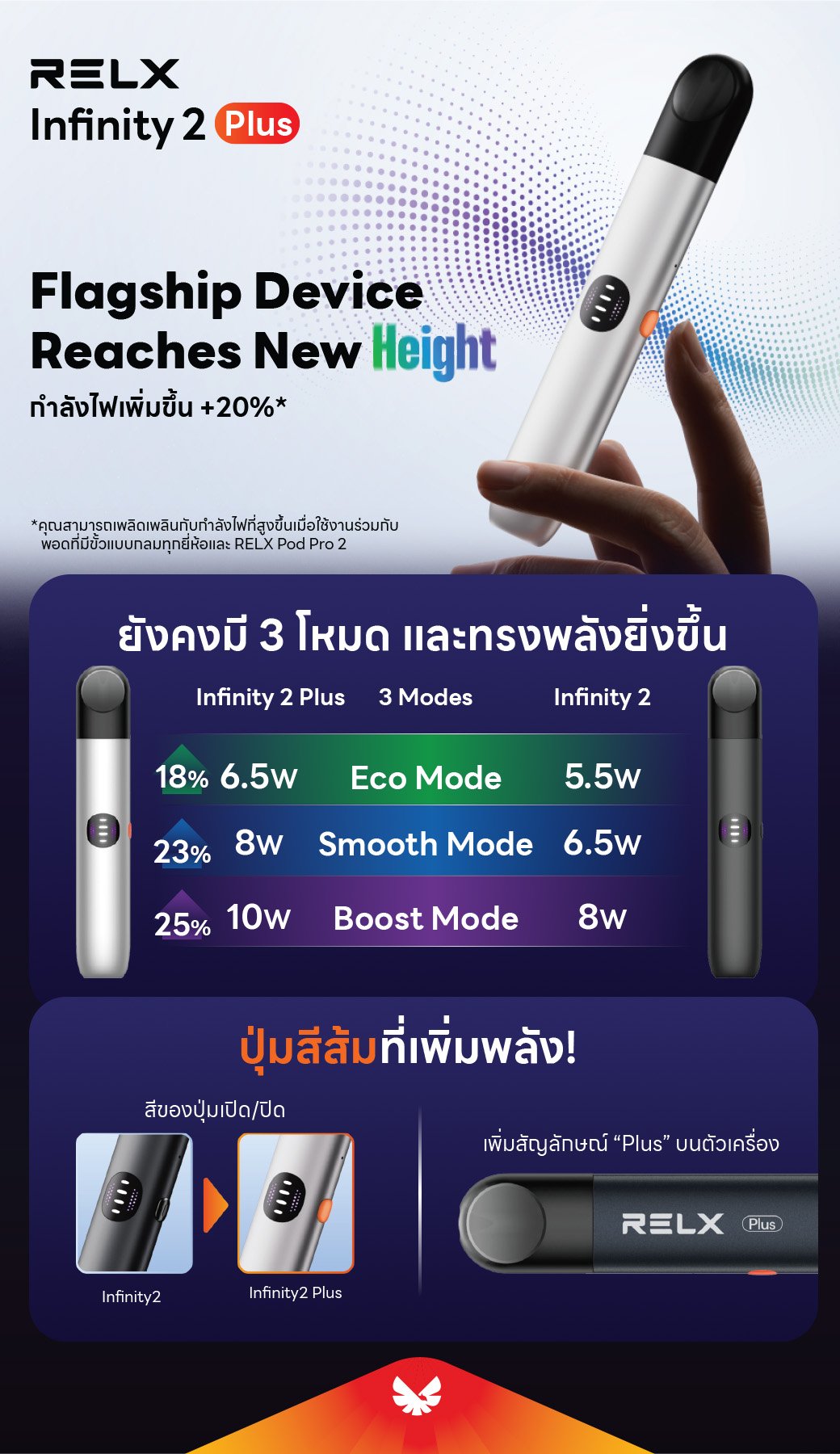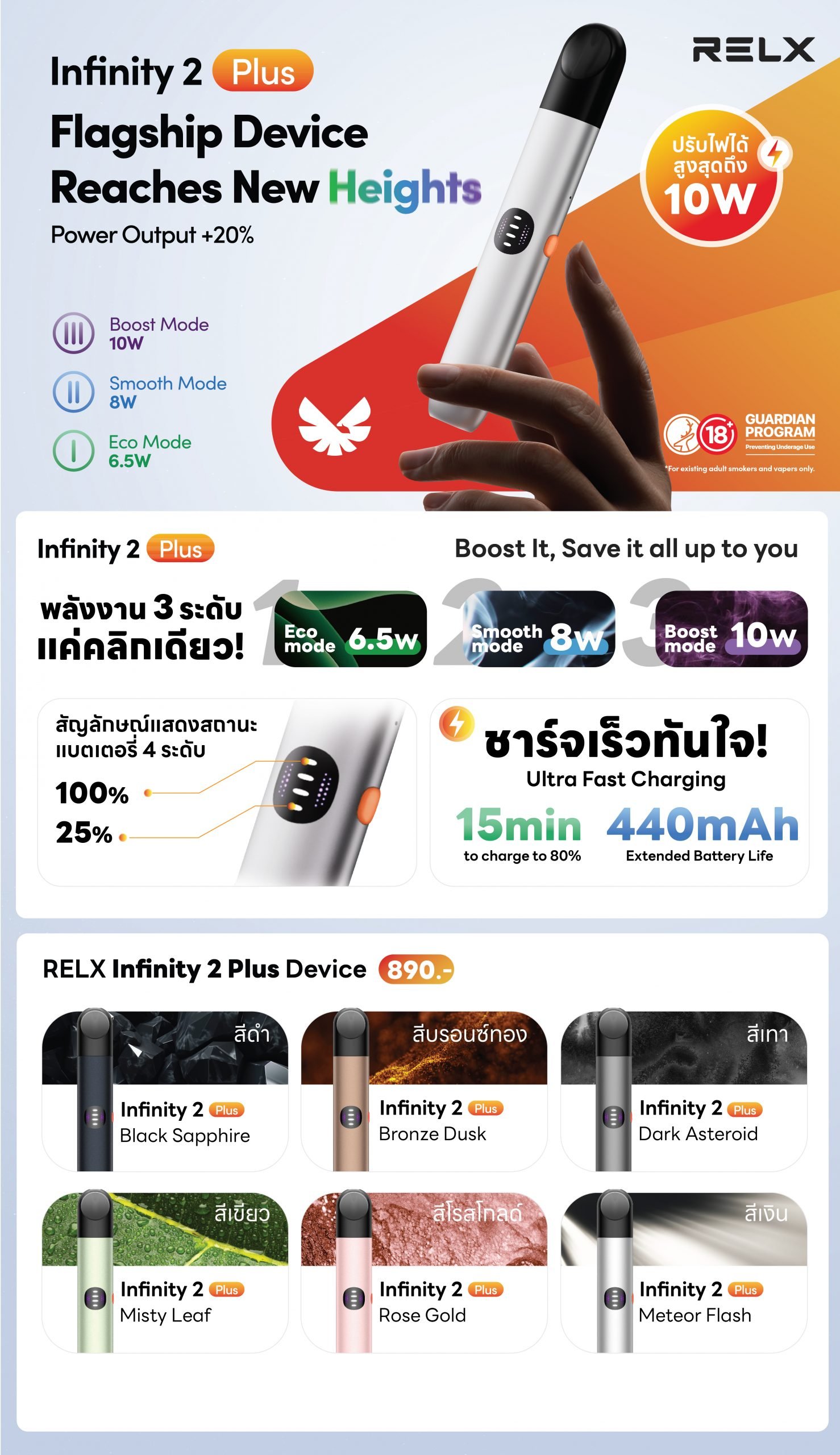 440mAh 電池比前代 380mAh 續航更持久,搭配三檔功率模式:Eco Mode (5.5W) 節能省電、Smooth Mode (6.5W) 經典順滑、Boost Mode (8W) 濃煙勁爽,兼顧續航與口感體驗。